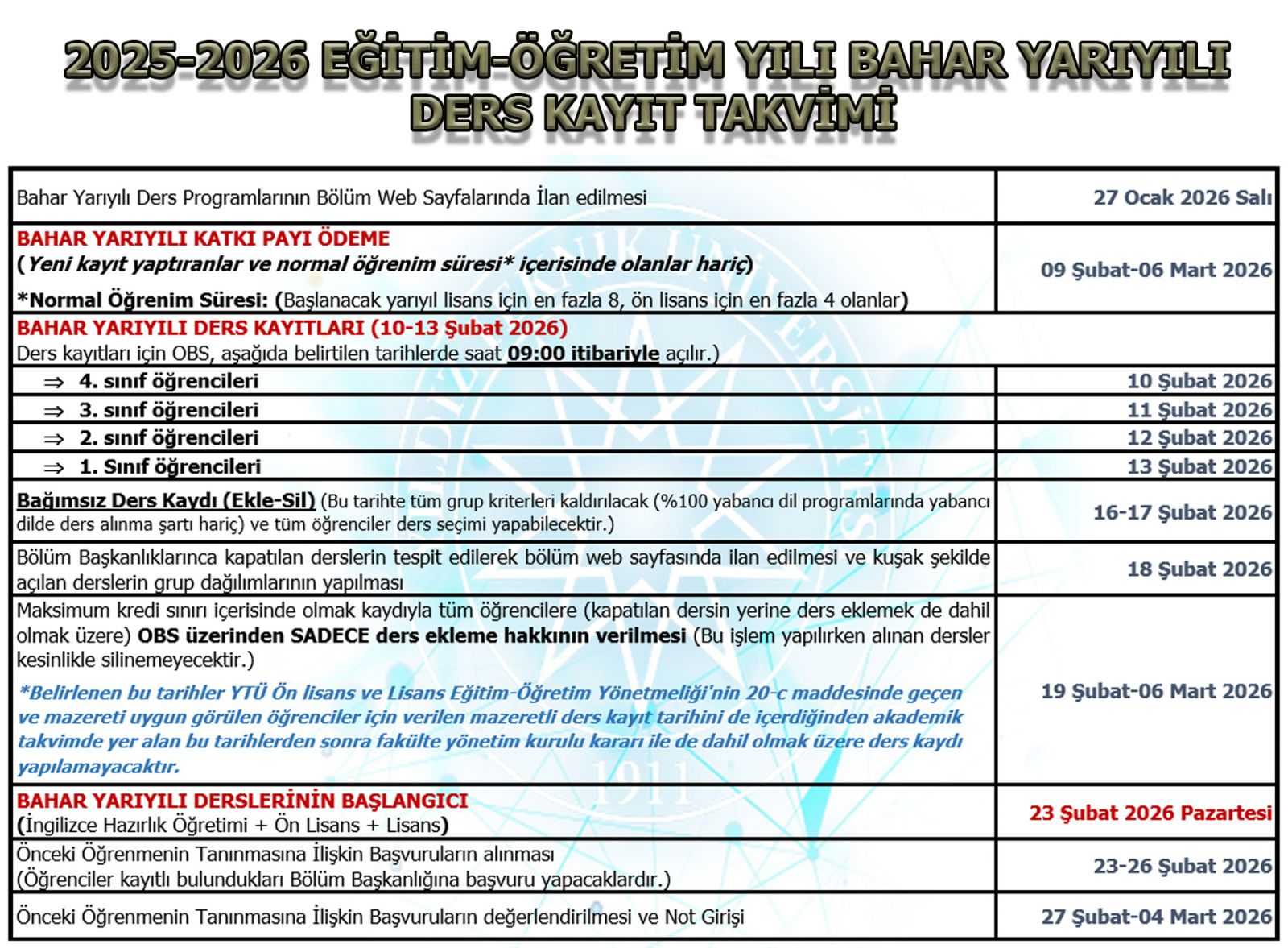 2025-2026 Eğitim-Öğretim yılı Bahar yarıyılı ders kayıt işlemleri 10-13 Şubat 2026 tarihlerinde gerçekleştirilecektir. Ders kayıt takvimi ve Ders Kayıt Kılavuzları sayfada belirtilmiş olup, YTÜ Lisans Akademik Takvimi için buraya tıklayınız.
