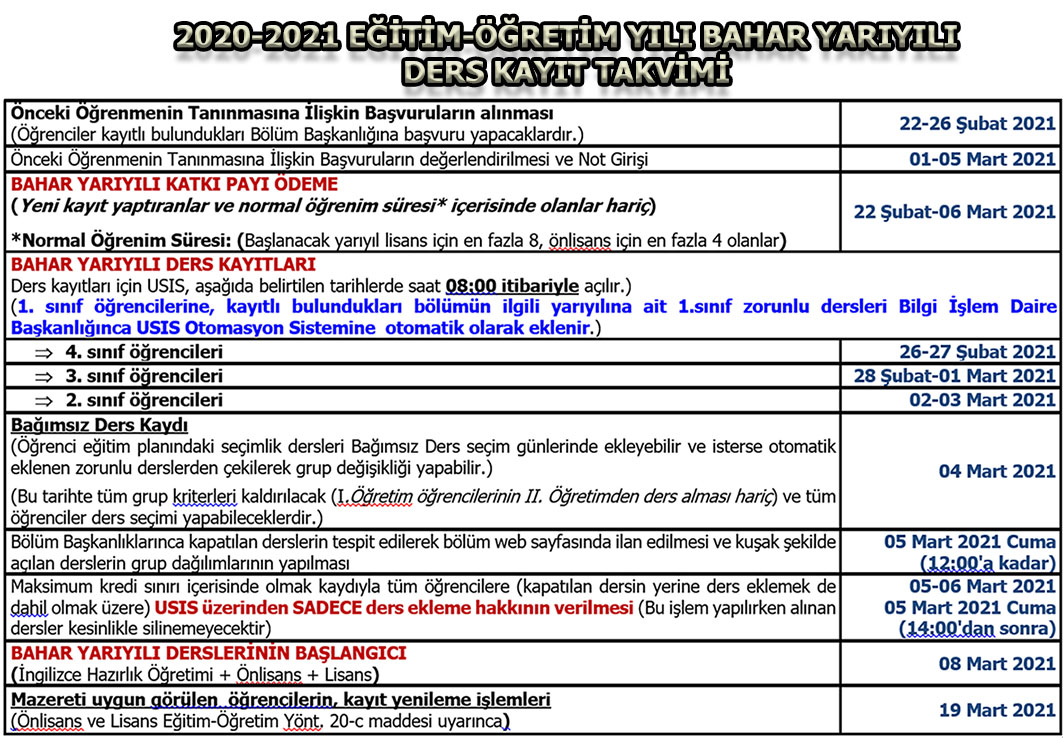Rektörlüğümüzün görüşleri doğrultusunda her bir sınıf bazında ders kaydı için 2 gün verilebilmesi için takvimde düzenleme yapılmış olup, 2020-2021 Eğitim-Öğretim yılı Bahar yarıyılı ders kayıt işlemleri 26 Şubat-06 Mart 2021 tarihleri arasında gerçekleştirilecektir.