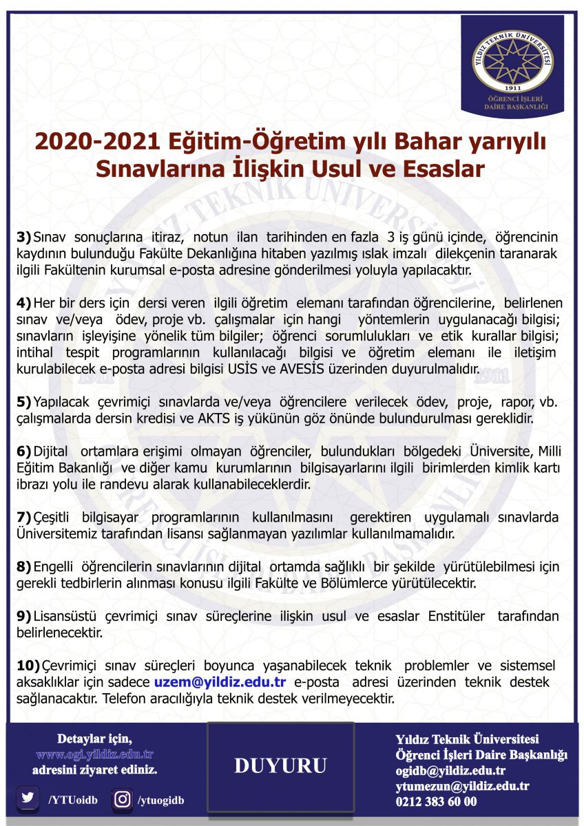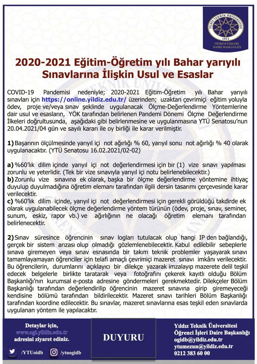 Üniversitemiz 2020-2021 Bahar Yarıyılı Sınavlarına İlişkin Usul ve Esaslar hakkında alınan 20.04.2021/04 gün ve sayılı Üniversite Senatosu kararı duyurumuz ekindedir.