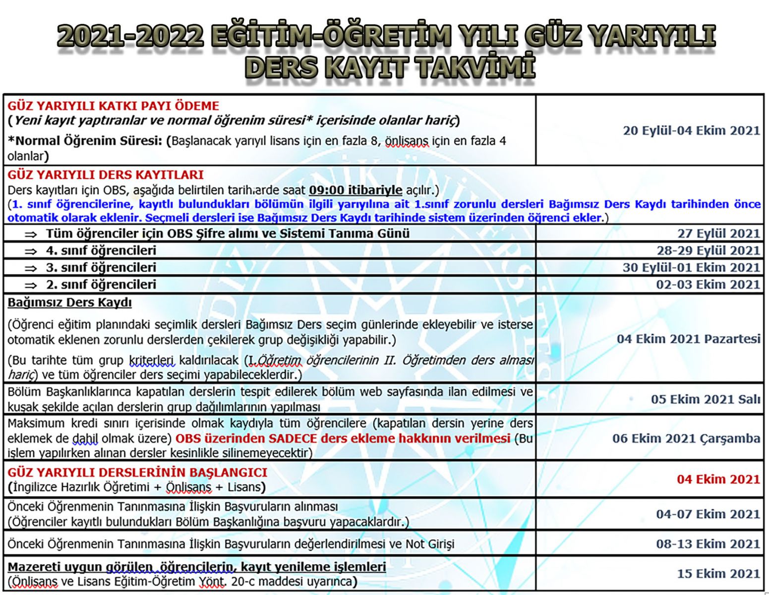 - 31.08.2021-07-02 gün, sayı ve sıra sayılı Üniversitemiz Senatosu kararı ile, “2021-2022 Eğitim-öğretim yılı Güz yarıyılında öğrencinin ders programında çakışma görülmesi durumunda, çakışan derslerden birinin uzaktan eğitim yöntemiyle veriliyor olması şartıyla, çakışan en fazla iki dersin seçilebilmesine imkân tanınmasına; alttan alınan ders için devam mecburiyetinin aranmamasına” karar verilmiştir. Ancak sistem, çakışan derslerin alınmasına izin vermediğinden bu kapsamda ders almak isteyen öğrencilerimizin dilekçe ile kayıtlı bulundukları Bölüm Başkanlığına başvuruda bulunmaları gerekmektedir. İlgili Bölüm Başkanlığının uygun görüşü üzerine Fakülte Yönetim Kurulu kararı ile bu dersler eklenir.
