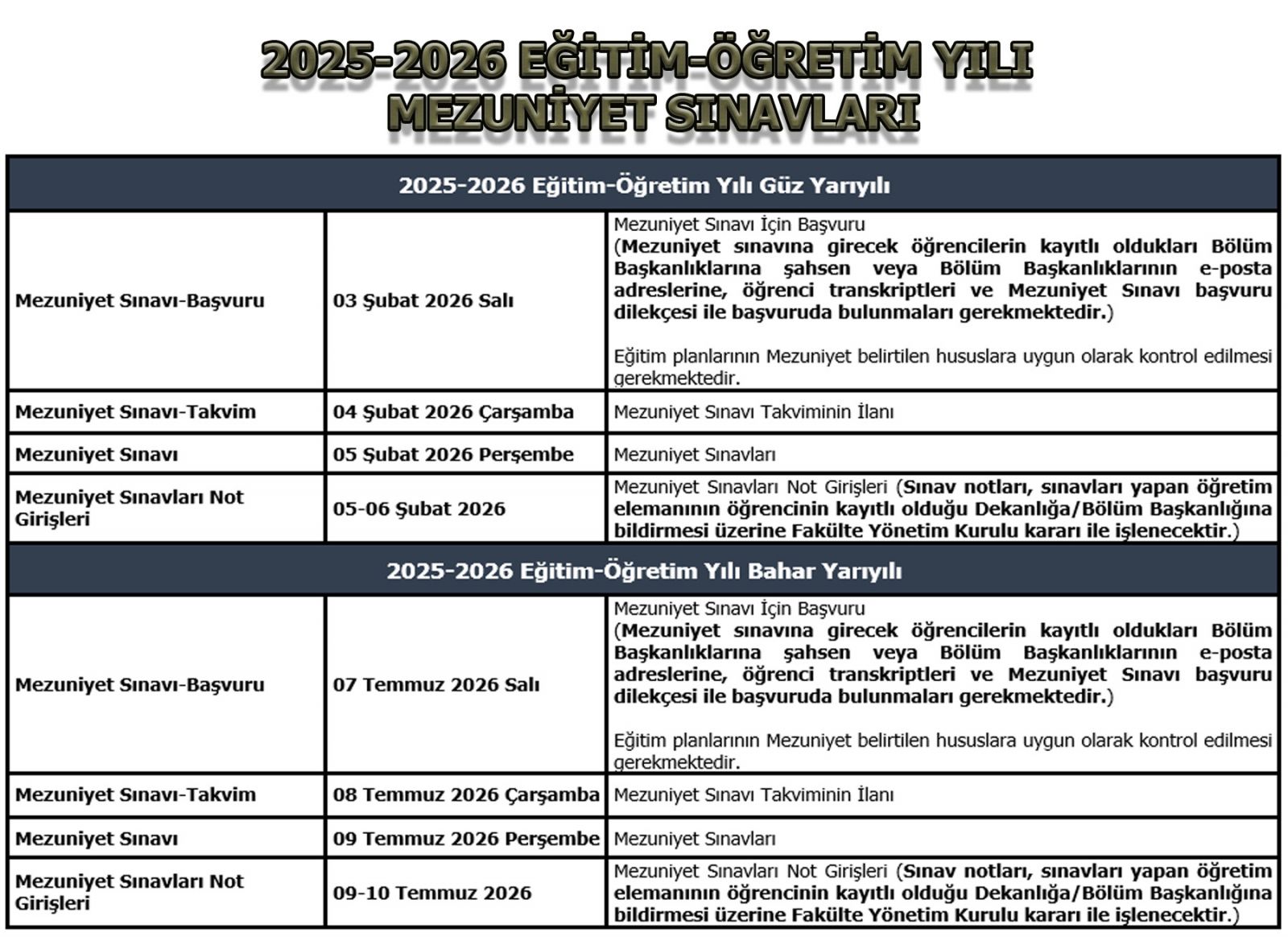 - Mezuniyetlerine en fazla iki dersi kalan öğrencilere; akademik takvimde belirtilen tarihlerde yapılmak üzere, başarısız ve yabancı dil kredi eksikliğini gidermek için 2. maddede belirtilen dersleri için (İşletmelerde Mesleki Eğitim, Staj ve Bitirme Çalışması vb. dersleri hariç) mezuniyet sınavı yapılır. (12.09.2024/08-12 gün ve sayılı Senato kararı ile değişiklik yapılmıştır.)