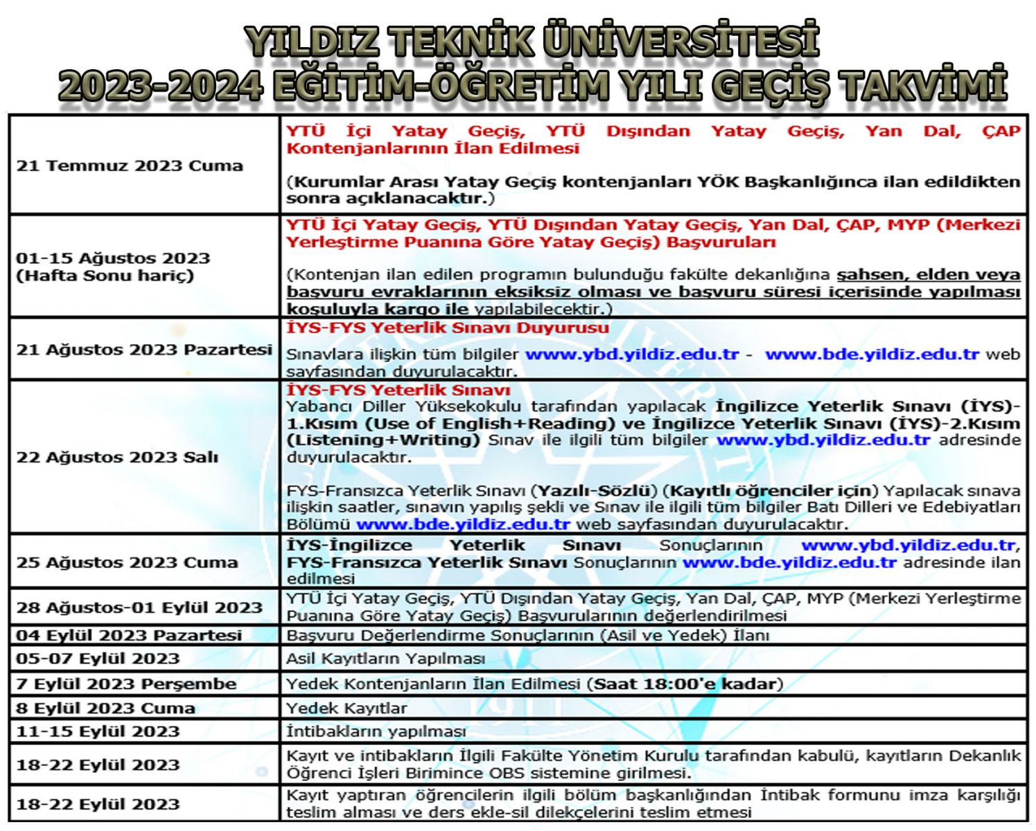 Üniversitemiz 2023-2024 Eğitim-Öğretim yılı Kurum içi Yatay Geçiş, Çift Anadal, Yan Dal, Kurumlar Arası Yatay Geçiş (Yurt İçi-Yurt Dışı) ve Merkezi Yerleştirme Puanına Göre Yatay Geçiş başvuruları 01-15 Ağustos 2023 tarihlerinde kontenjan ilan edilen programın bulunduğu fakülte dekanlığına şahsen, elden veya başvuru evraklarının eksiksiz olması ve başvuru süresi içerisinde yapılması koşuluyla kargo ile yapılabilecektir.