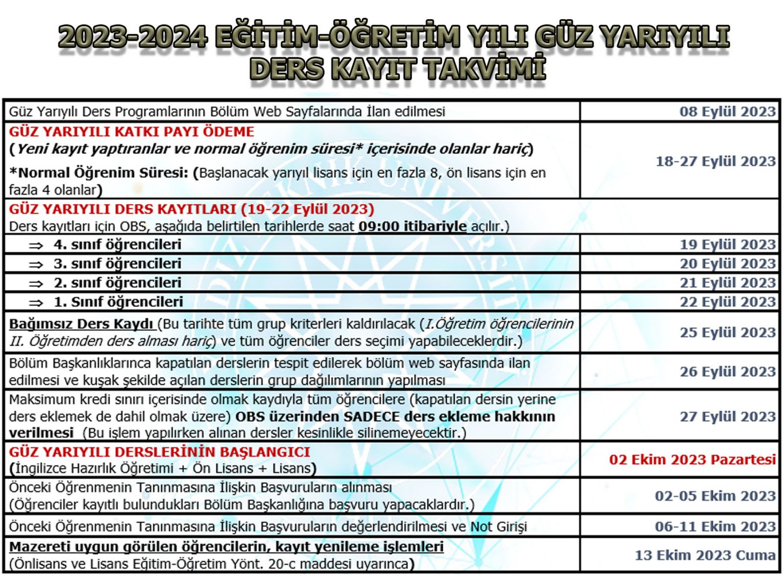 2023-2024 Eğitim-Öğretim yılı Güz yarıyılı ders kayıt işlemleri 19-22 Eylül 2023 tarihlerinde gerçekleştirilecektir. Ders kayıt takvimi ve Ders Kayıt Kılavuzları sayfada belirtilmiş olup, YTÜ Lisans Akademik Takvimi için buraya tıklayınız.